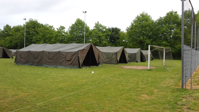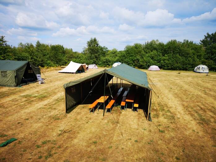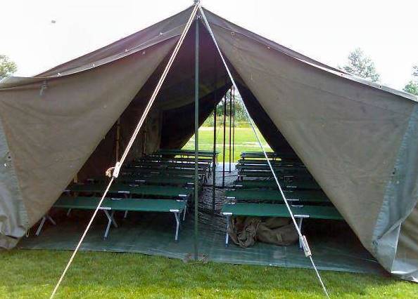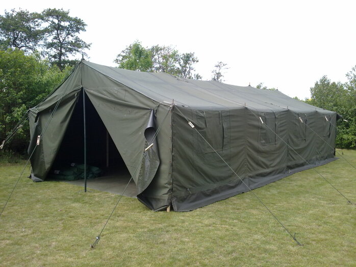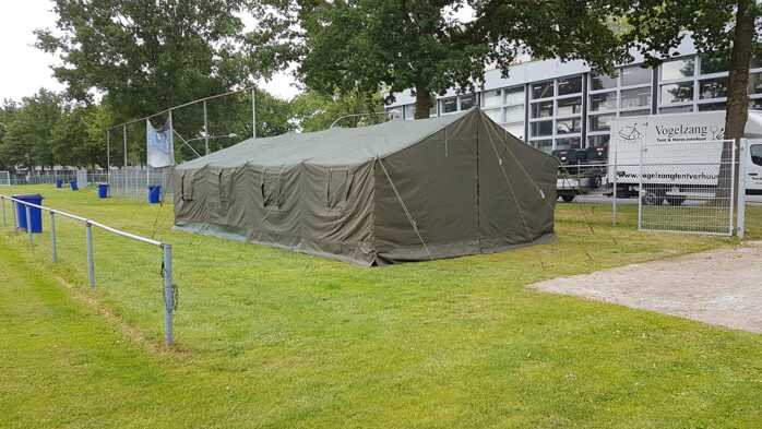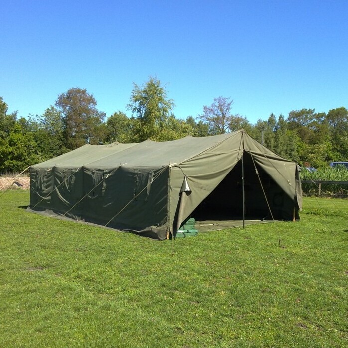 De legertent 5 x 10 meter is geschikt om met 20 personen in te slapen.
